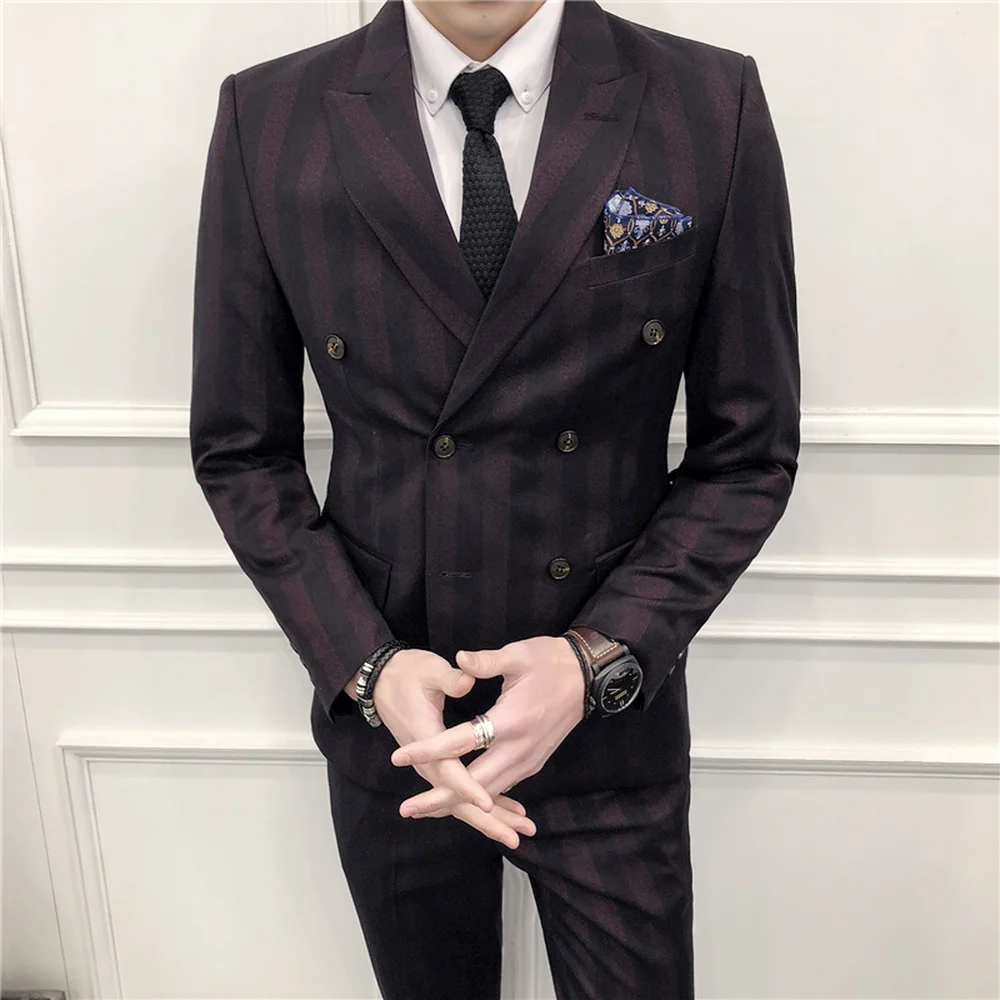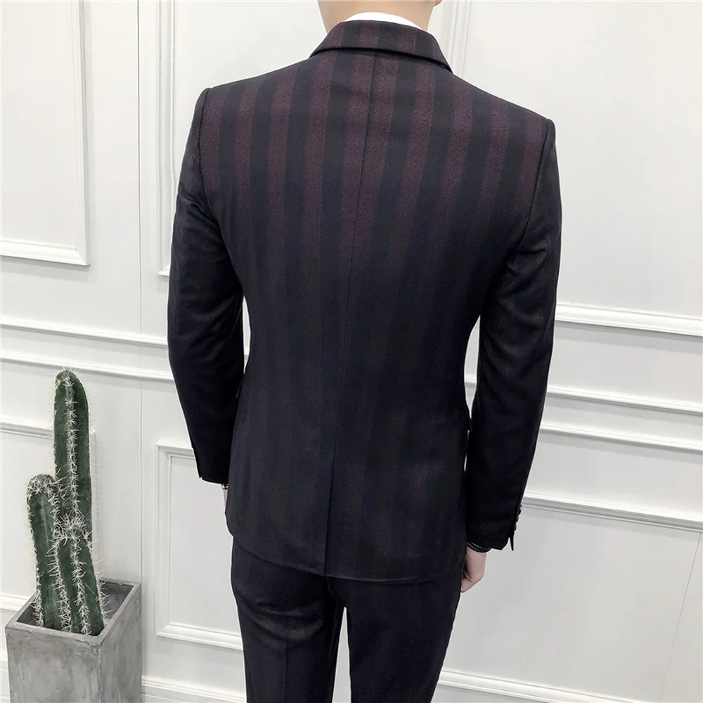 Special Price of (Tops + Pants + Vests) Suits Men's Double Breasted Groom Wedding Dresses Korean Slim Striped Small