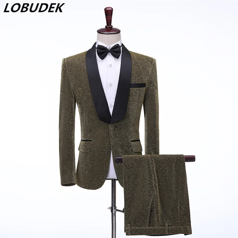 Limited Price for Men's Formal Suit Shawl Collar Golden Silk Blazer Pants 2 Pieces Set Wedding Groom Dress Prom Eveni